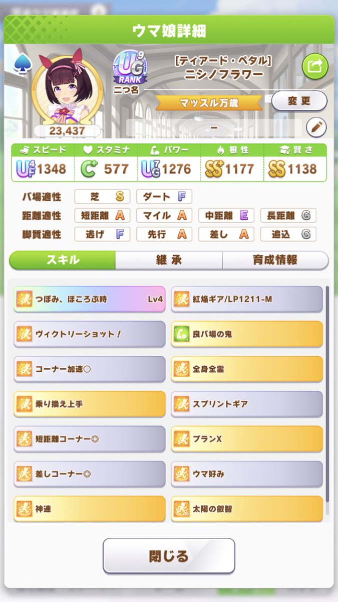 自身でつよつよ加速固有があるタイキやフラワーにはいらないかもですが名無しのトレーナー曲線のソムリエってスプリントギア以上鍔迫り合い未満って感じかしら?名無しのトレーナーチャンミなら積み得なんですけど今回ですと運ゲー寄りのスキルに数百ポイント振ってる余裕がないんですのよねえ…