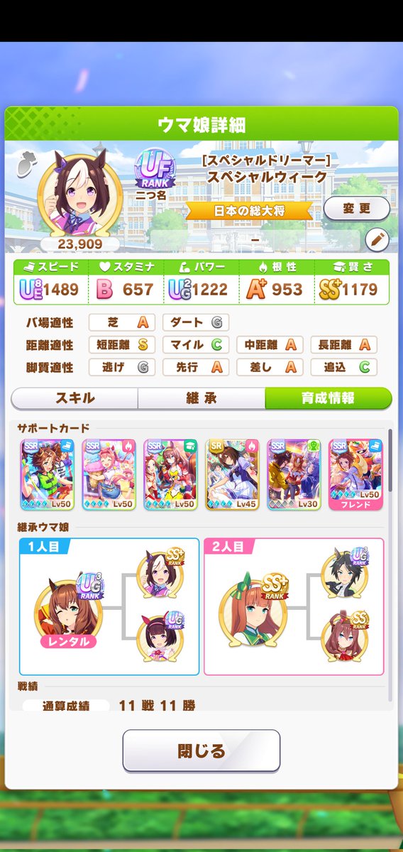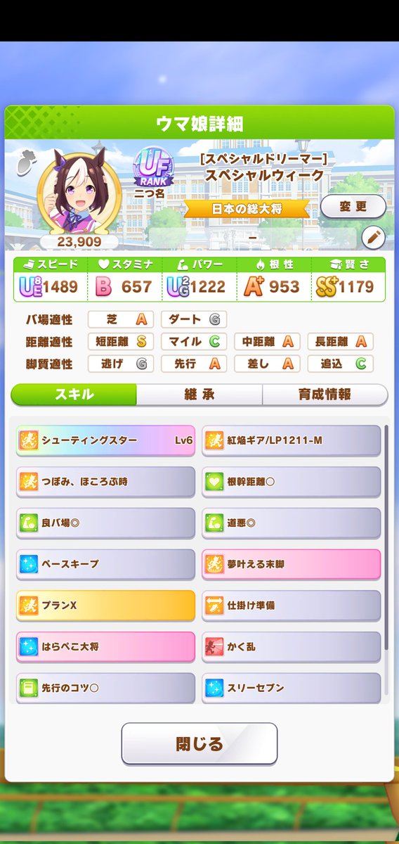 Fだと普通のキャラでS付くような確率でようやくAになるという…名無しのトレーナーいい感じのステスキルにならないとかじゃなくてそもそも何度やっても距離Aにすらなかなかなってくれなかったりするのいいですよね名無しのトレーナーアリエス杯用のウインディちゃん魔改造の時は距離と馬場両方F以下だからマジでキッッツかったよ……(芝Fと長距離G)