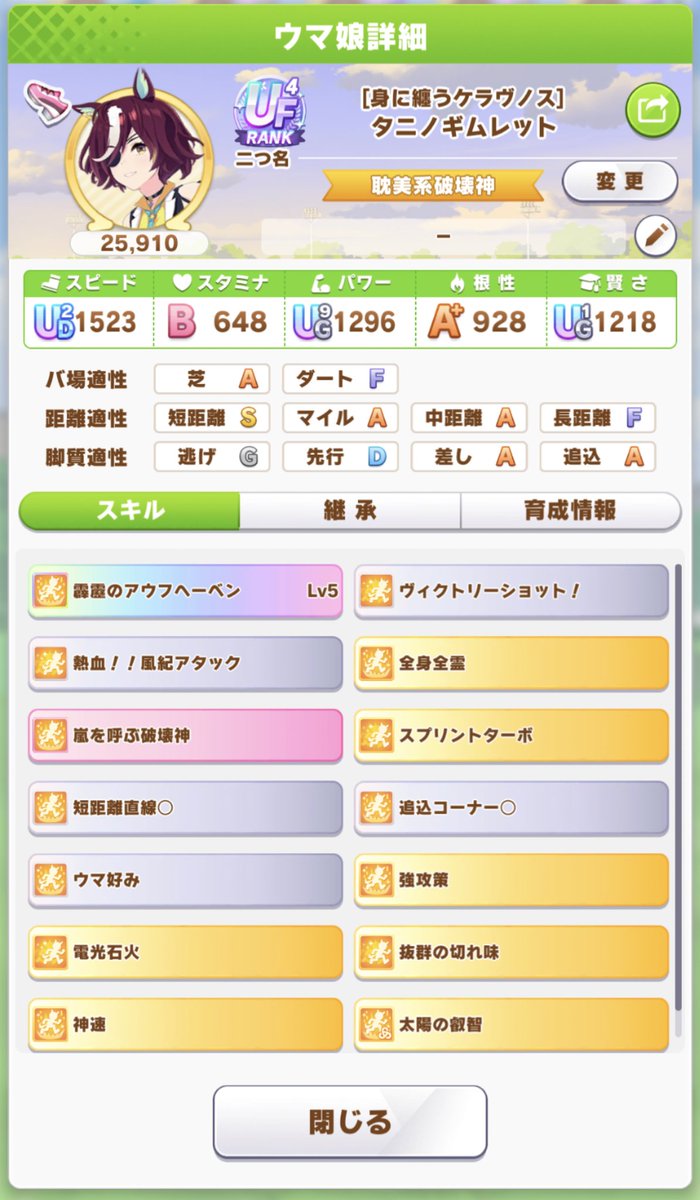 距離S風アタ石火切れ味ターボヴィクショ終盤加速ヤケクソ短距離魔改造ギムレットです 全然ダメかと思ったけど結構やりおります てか他2枠完成してないから1番勝つ ちゃんと追込で破壊神活かすスタイル ほらそこ疑似デュランダルとか言わない pic.twitter.com/ttxnyazMmR