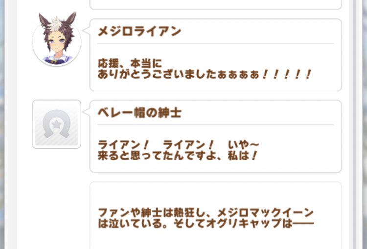 スパーホースです!!オグリキャップです!!の流れも好きオグリキャップは戦績を調べて駆け抜けたキャリアの最後になる90年有馬記念の復活劇を見ると本当に胸にくるものがある。そして「りゃいあん!りゃあいあん!」とメジロライアンの名前叫んどきながら「私なんかはいの一番にオグリキャップに謝らなくてはならない」とか言ってた大川お爺ちゃんがかわいいすっかり忘れてたけどメジロライアンを育て直し、勝負服まだ取ってなかった(汗)シニアの有馬記念、このベレー帽の紳士って大川慶次郎氏だよなぁ……りゃいあん!りゃいあん!。ちなみに隠しイベントほどではないけどシニアの有馬記念は戦績次第でセリフがちょこっと変わる(連覇かどうかで)<ウマ娘 pic.twitter.com/FSMKv1W24Bライアンの有馬後に出てくるベレー帽の紳士、これが「りゃいあん!」でおなじみの大川さんなのかな?