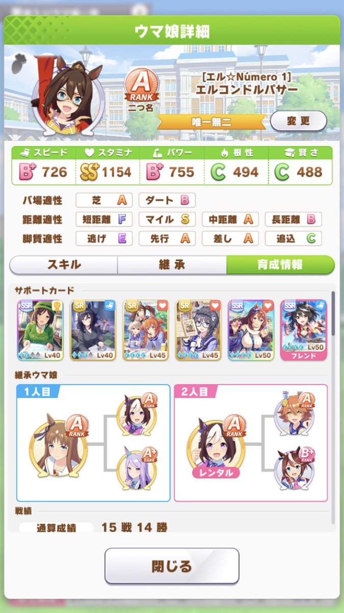 因子周回。こんな感じのステのエルちゃんでスタミナとパワーを狙う場合。