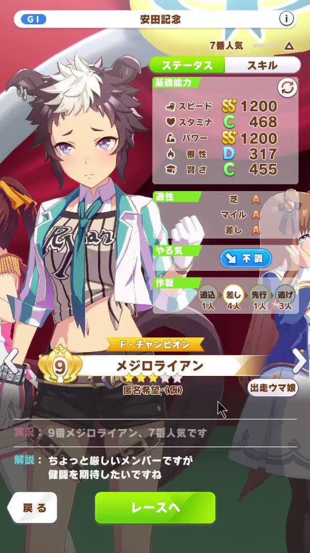 やっぱりライアンはマイル差しでワンチャンあるわライアン、固有発動すればマイルでも超強いけど、いかんせん発動しねえやはりマイル…マイル改造ライアンで行くか