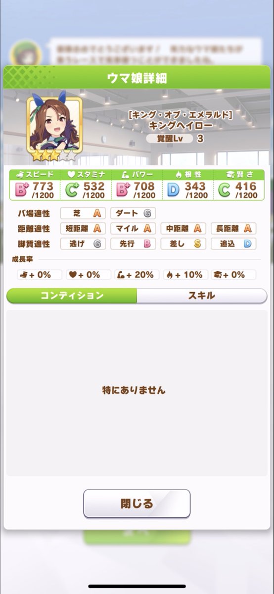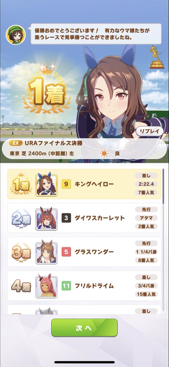 楽しいふぅ…差しのキングヘイロー、結構前に育成してURA取れてなかったから久々に育成。スピB+で、最終直線で馬群に埋もれてるしもうダメと思ったら、スキルが有効に働いて首差勝ち。