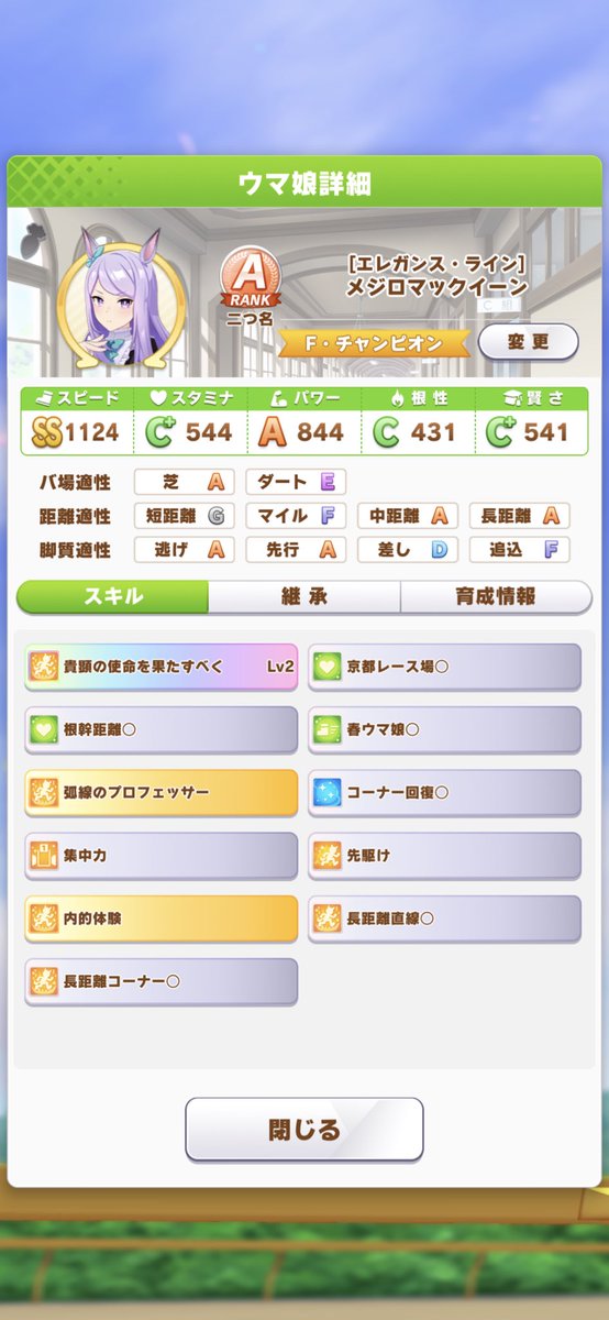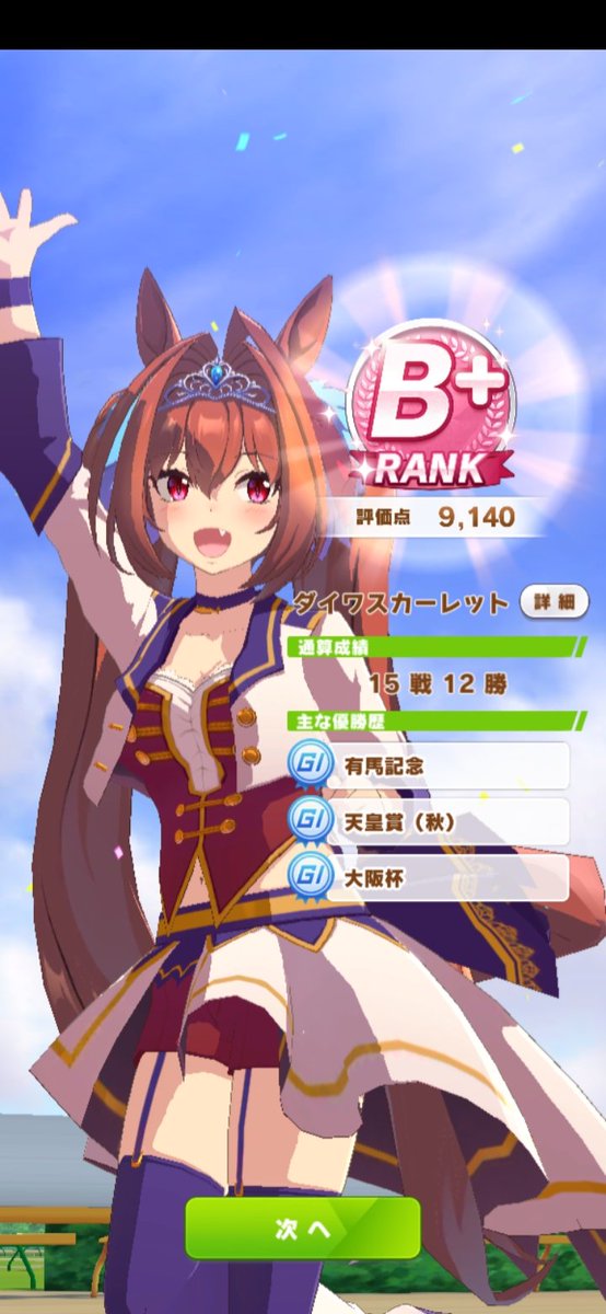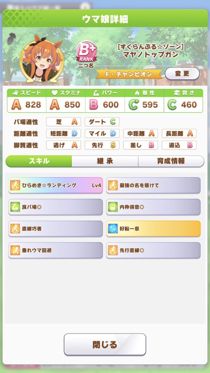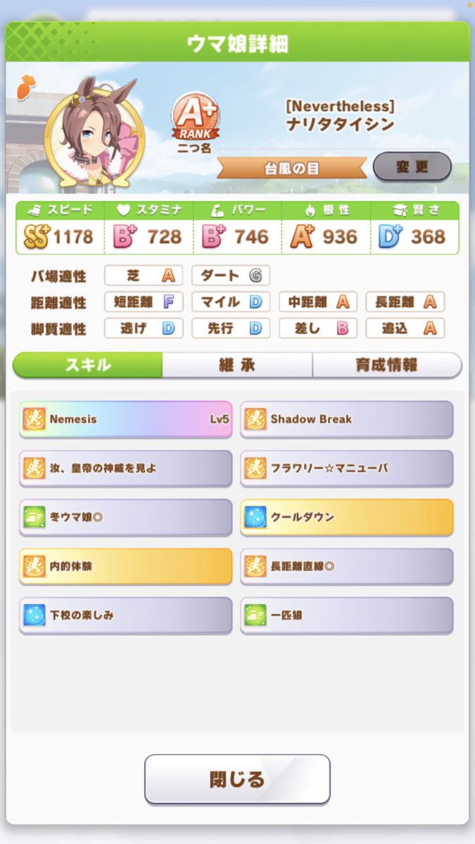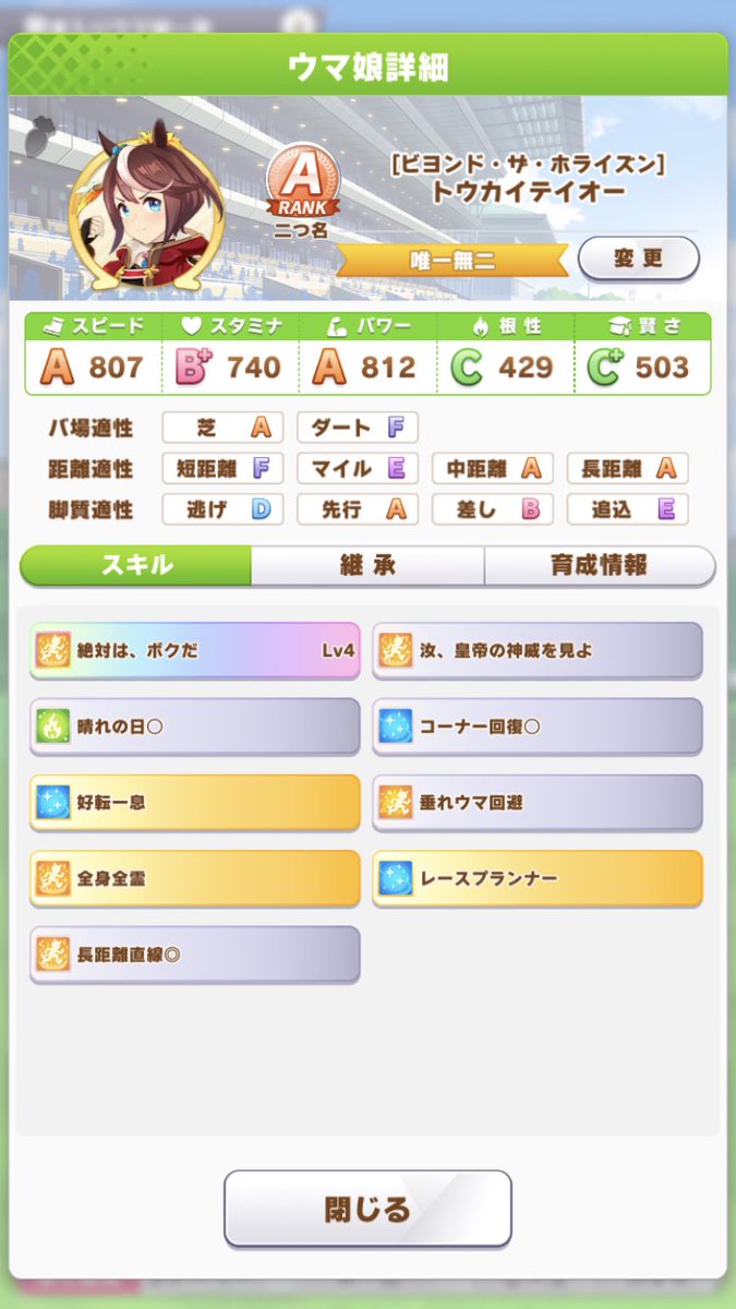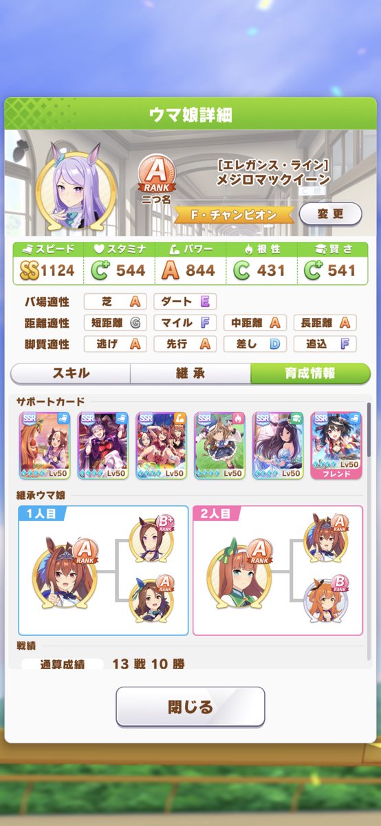 #ウマ娘 pic.twitter.com/LCzqjlbcQwはじめてまだ半年位、端末非対応でガチャ引けず無課金で初期メンツのみと初期配布とイベント配布のサポカのみ、育成フレンド頼み現在の限界はB+。