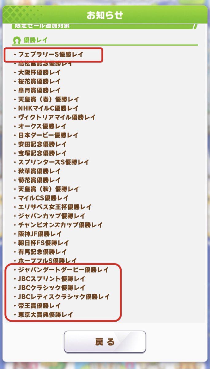 将来的に優勝レイの価値がどうなるかは今の所は未知数ですけど、ダート系G1は恐らく不足しがちになると予想できるのでダート系がショップに並んだ際は購入を超オススメします?♂️pic.twitter.com/XTACeRNmSW W菊花賞の優勝レイが不足しがちで困りますねぇ…まさかここで朝日杯優勝レイが不足するとはこのリハクの目をry菊花賞優勝レイ常時不足してる、1着で15個ぐらい欲しい天皇賞(春)と桜花賞