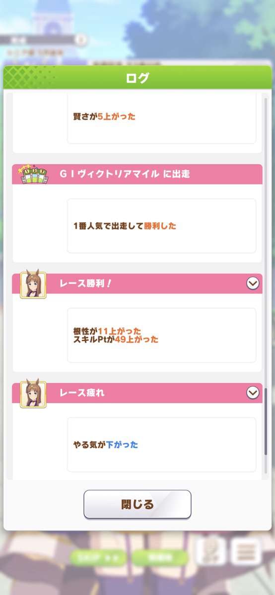 レース疲れって体力0でレース出ても起こるんだ体力0でレース出たらレース疲れイベント来るんだ 初めて知った因子周回で「レース疲れは連続出走しなくても発生する(体力0の場合)」「スズカはバレンタインから4連続出走しても肌荒れにさえならなければやる気ダウンを学園祭で帳消しにできる」「スズカはシニア9月から秋天までノーリスクで連続出走できる」などの知見を得たレース疲れって2連続でも出ることあるんだ