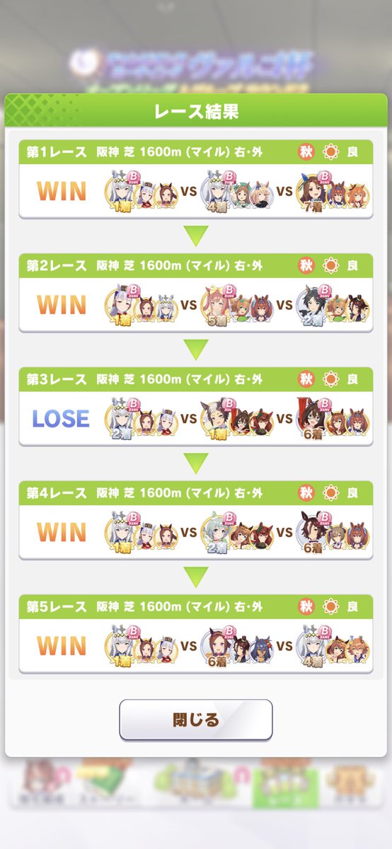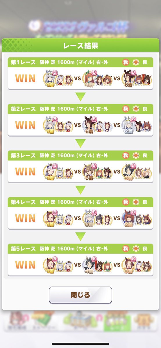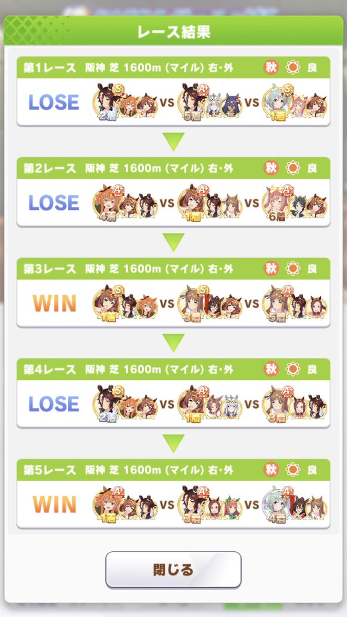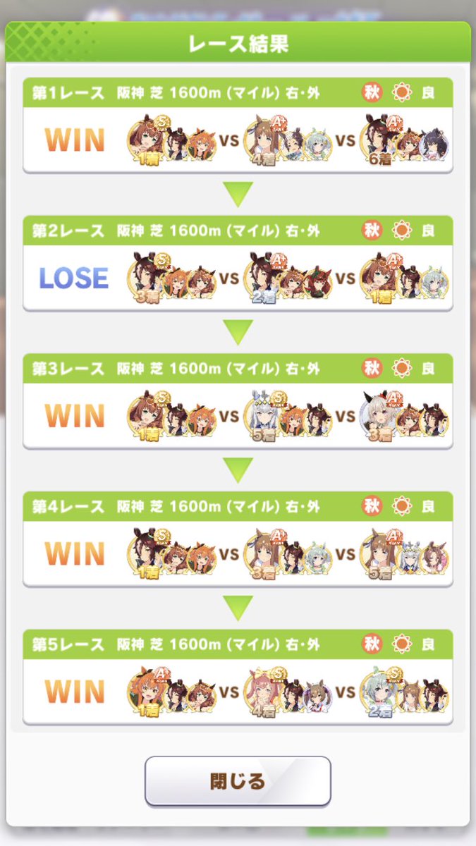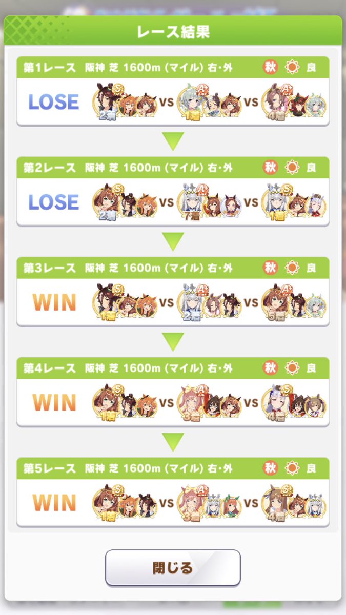 2敗目はライアンが固有と上昇気流でぶっ飛んでいった pic.twitter.com/ZKH6H5iLTKヴァルゴ杯、さすがにラウンド2は完成された水マル毎回出てくるな、相手が調子悪い場合でないとウチのウンスは負けるwヴァルゴ杯ラウンド2は2勝しかできませんでした。ヴァルゴ杯予選ラウンド2初日は4-3-2-5でマルゼン6マヤ3ウオッカ5。地固め持ちの強い逃げが増えてきた。こちらも強い逃げ差し揃えれば一枠遊べそうな感触はある pic.twitter.com/bZJZc3IF5cヴァルゴ杯(ラウンド2)1日目。
