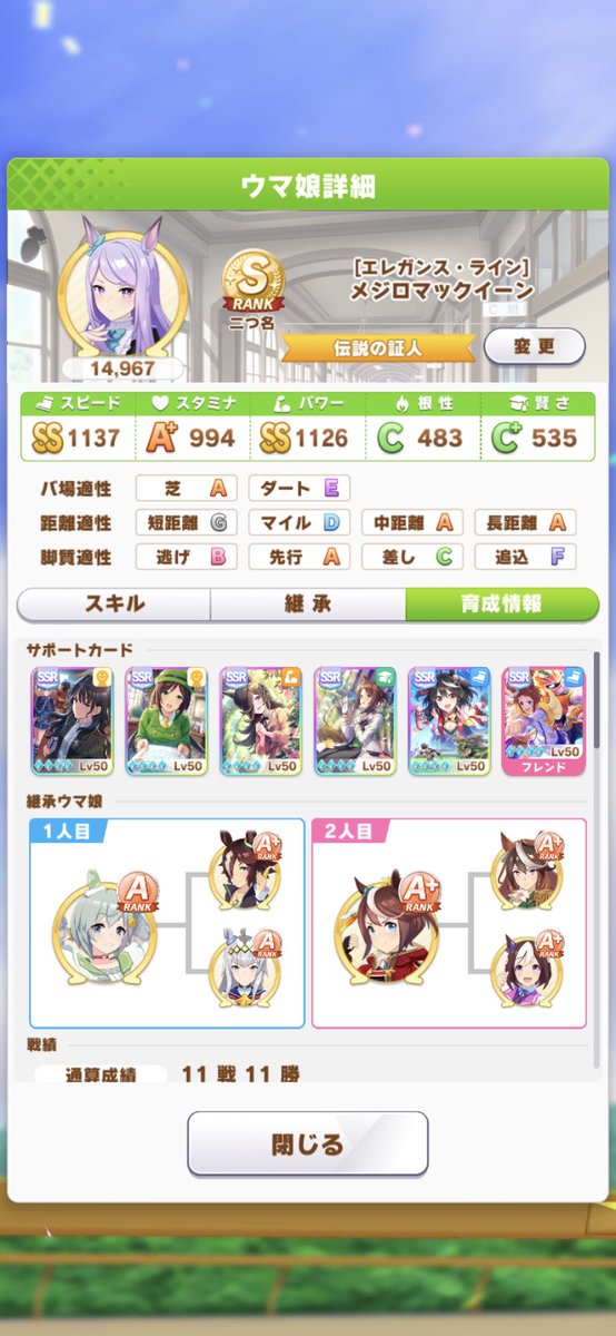 あとたづなはコンセよこせ pic.twitter.com/0yoyxo5tvd取り敢えず、暫定ライブラ杯用追込ゴルシと先行マック。ゴルシはパワーあと1欲しかったね?A+ですが芝Sが付いたので、見た目よりはステが盛れています。(実質パワー1100位)賢さ601は無理なので諦めた。後、このゴルシ前に行き過ぎて、固有が出なかったりする。それでも結構勝ってくれますが�pic.twitter.com/5B82zbiY4r 4r試しに先行マック 因子は所持長距離因子都合でスタ6パワ12サポカはW友人