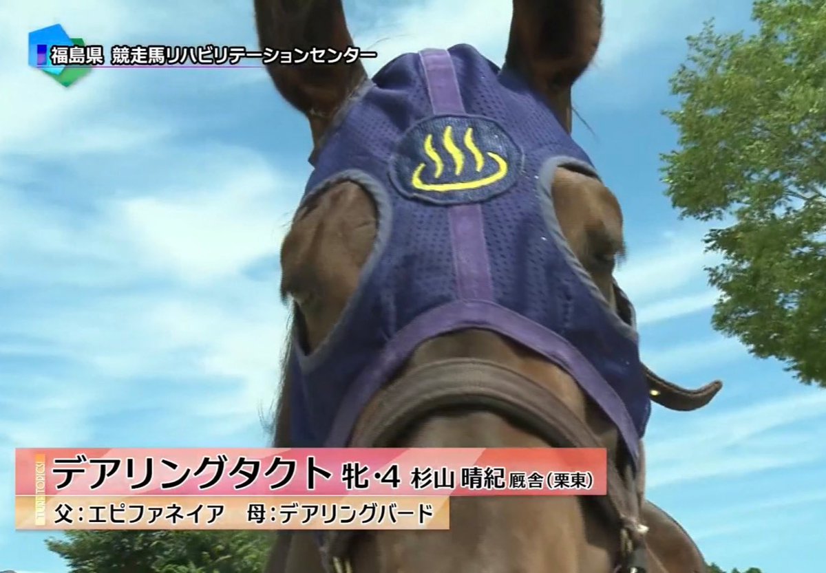 温泉マークのメンコつけてるの可愛い(笑)少し前に福島県いわき市のウマの温泉(JRA競走馬リハビリテーションセンター)に行ったら、デアリングタクトがいてかなりビックリしたただ馬を数か月ぶりに生で見に行きたくなって行っただけなのに、こんな大物がいるとは思わないじゃん???? pic.twitter.com/O4mgk9EqtJ
