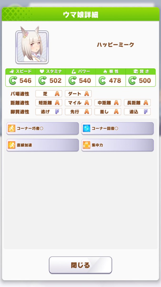 ハッピーミークちゃんがどのレースでも活躍しやすいように均等にステータスを上げている印象がありますね!
