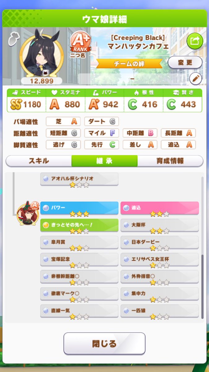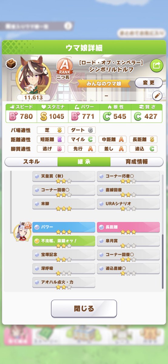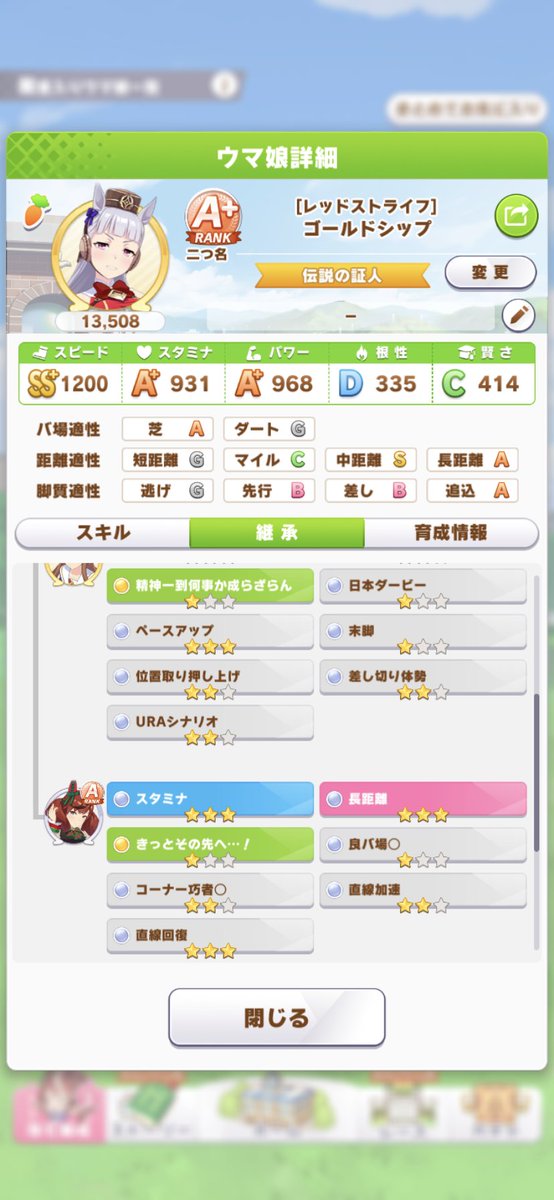 追込因子6以上のフレンドが欲しいチャンミは勝って嬉しいけど自分の目標は神因子の代表作ってフレンド満員にする事だから因子厳選頑張りましょうかね。