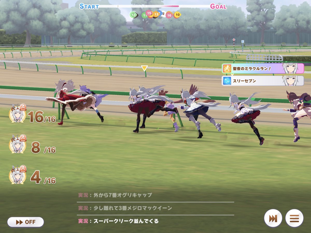 クリスマス先行オグリですが東京2000で鬼神の如き強さでした。スリーセブンでた時点で固有発動すると誰もついて来れないです。いえーーーーーーーーーーーーーーい!!!!!!!!!!!!!!!かわいい〜〜〜〜〜〜〜〜〜〜〜〜!!!!!!!!!!!!オグリ〜〜〜〜〜〜〜!!!!!!!!!!!! pic.twitter.com/PZwe9b6WNqケーキ食べたいよねオグリ。かわいいねオグリ新衣装オグリかわいい…しかもやっと温泉行けてご褒美が過ぎる♨️量産したので今までの新オグリ決定杯を練習でしてみたら楽しい。しかしチャンミで走らせるにはステ低過ぎる…?pic.twitter.com/paRdRiyjtL Lオグリ新衣装のスカート部分が好きなんですが、特に走ってる時の後ろ姿がめちゃくちゃに好きで頭おかしくなる。可愛い赤のフリルスカート………タイツも普段と色味が違ってとても好き…ずっと見てるクリスマスストーリー、