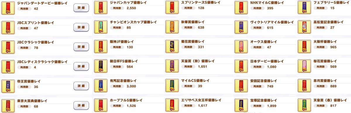 ふと「優勝レイで一番持ってるレイと持ってないレイって何だろう?」って思って確認してみた有馬が一番多い→まぁ目標多いし2回出れるし