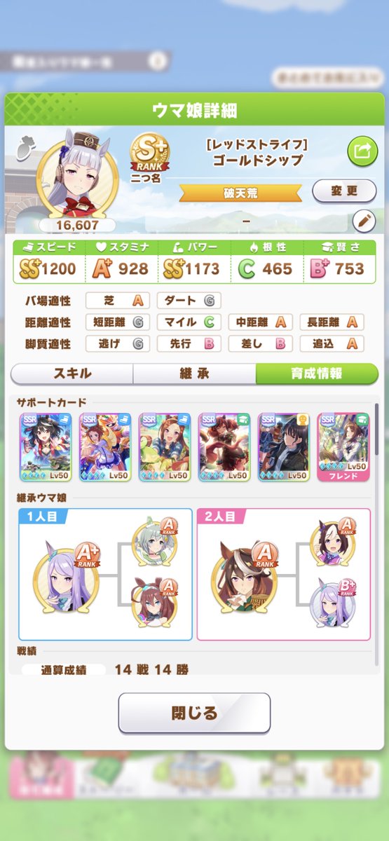 サジタリウス杯用のゴルシ失敗作。直線一気、アオハル力、赤因子が空振った以外は上手く育成出来ていただけに残念。因子はスピ6スタ3パワ9でサポカはスピ3賢さ2代理。これでスタミナ900を超えることが分かったのは収穫 #ウマ娘 pic.twitter.com/vp8z8Q7t1w因子も揃ったし編成も分かったからとりあえずゴルシから育成するかな適性Sはつきませんでしたが、ステータスだけなら結構良いゴルシ育成できました。あとは肝心のチャンミで活躍してくれるかどうかですが…