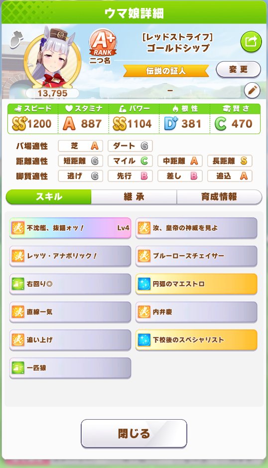 中盤スキル取ると前に出すぎてカフェの固有潰すので、終盤スキルばっか取った pic.twitter.com/so304XWI3Lゴルシ中盤スキル積みすぎると固有出ないのである意味難しいwサジタリウス杯想定で軽く試しに作ってみたけど下振れすぎて死にたくなったし、直線一気因子でかなり積んでるのに全然拾わんし、長距離じゃなくて何故か☆1の芝因子拾うしで鬱