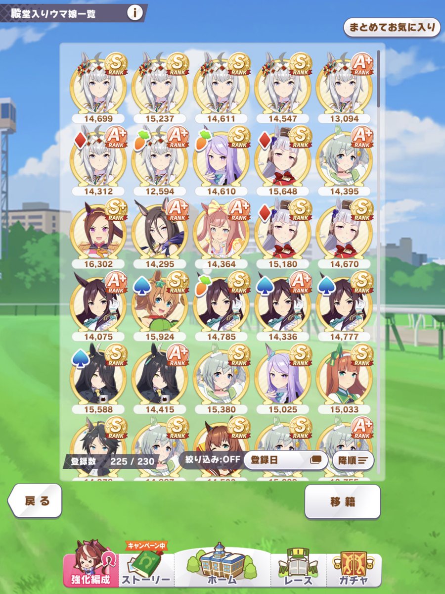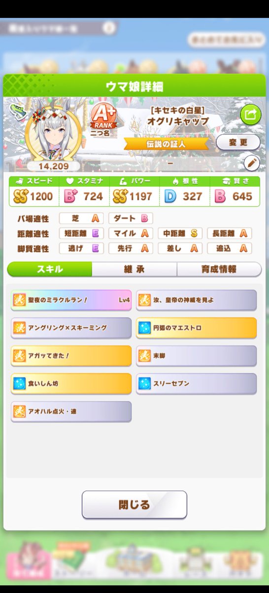 まず先差選び➡回復選び(金1、白2、補助1)➡?スピ完スト、賢さ800以上盛った上で高スタパワーも必要➡?回復にスキルポイント取られて残り限られた中で適切なスキル取り最低限これら条件を満たした上で上振れないと勝てる性能にならないし結局条件のどれか抜けちゃうわ
