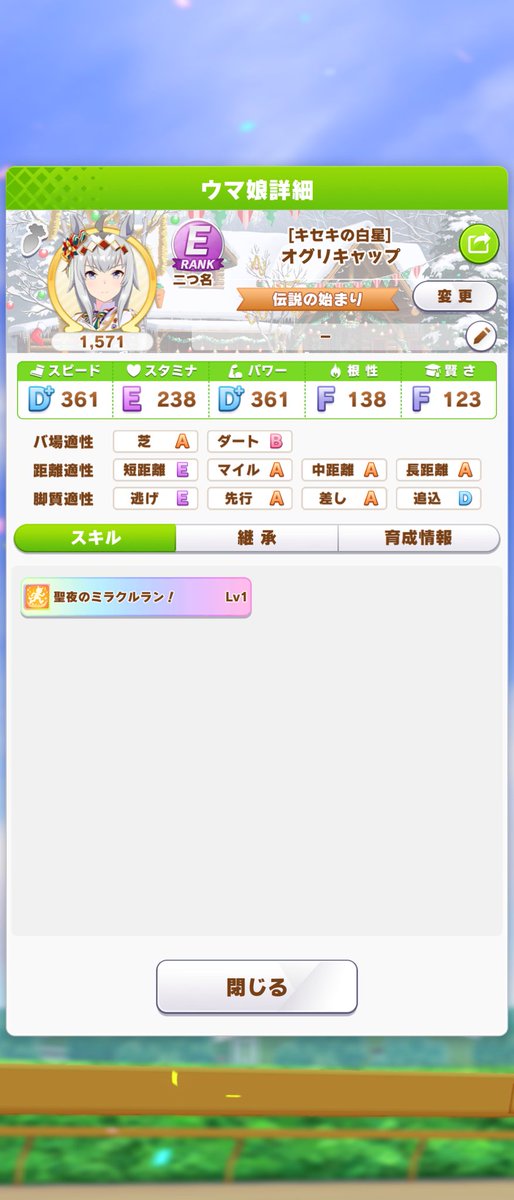 通常オグリちゃんと同じ感覚で育成すると失敗しやすいのかなぁ。あちらはホープフル一発勝負でも負けることは少ないですからね~