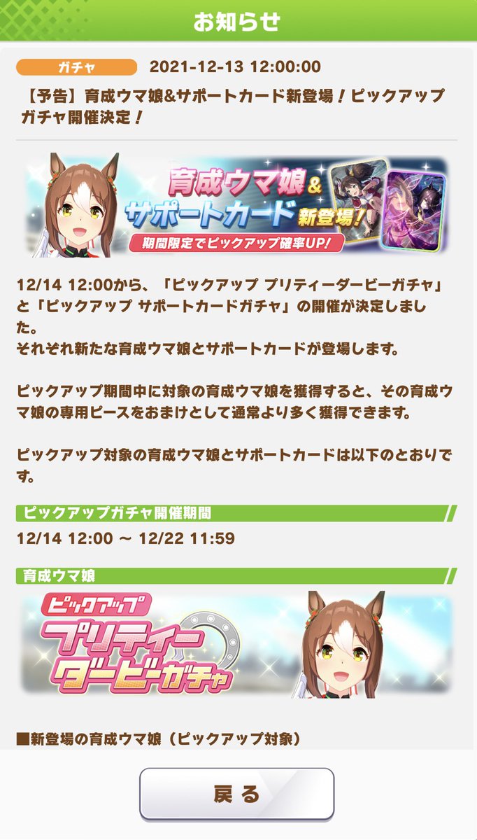 ウマ娘の次のガチャ更新が12/22と短期間なのに気づいた。