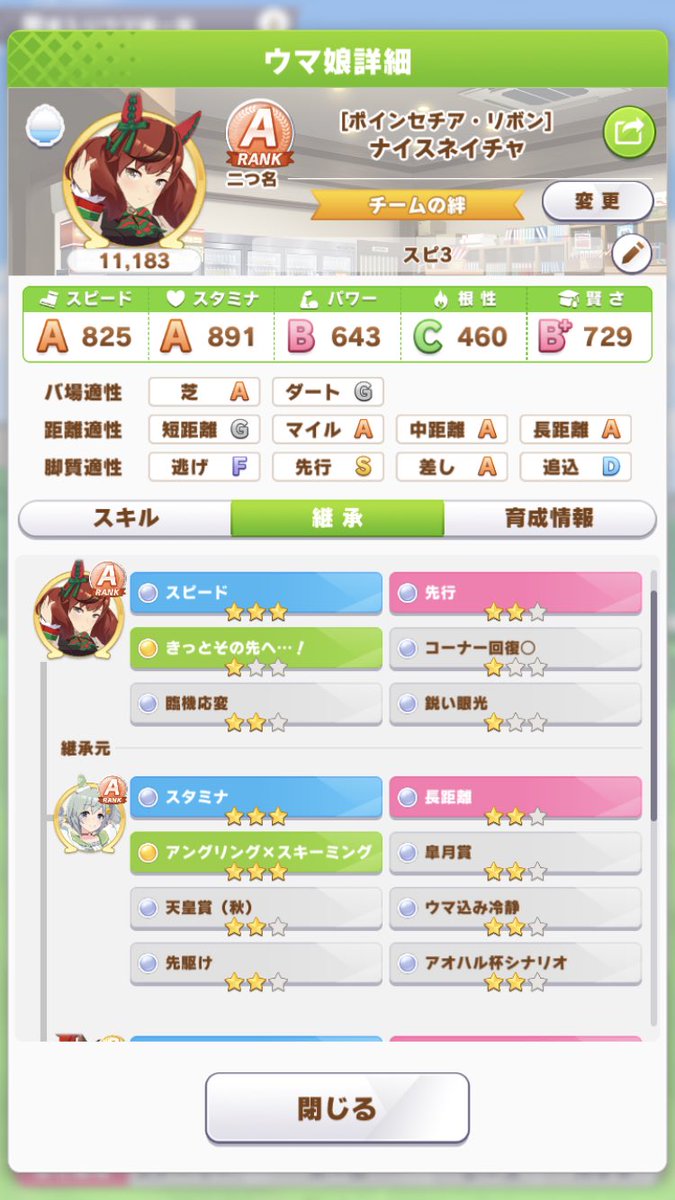 星3以上の因子の確率変わるのってSS以上になるかならないかだけだからSSになりそうにないんだったら走った方が良因子の率上がるよ