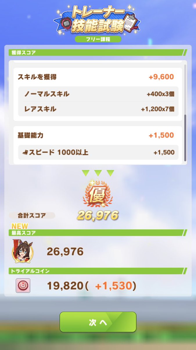 トレーナー試験その7、スピ賢デッキに代理入れて、レース出まくって金スキルたくさん取れたら楽勝でした。やはりエルコンドルパサーのダートも芝もマイルから長距離までいけるのはでかいてすね。 pic.twitter.com/5i7I6FVMoT#ウマ娘