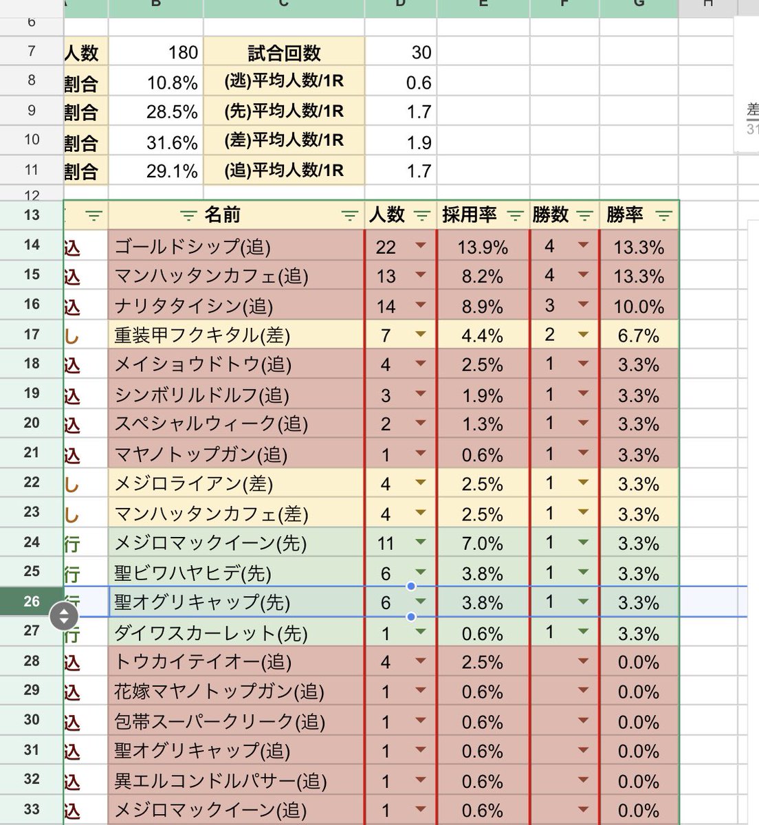 ただ脚質分布によるところが大きいので自分の出走メンバーに有利になるようなマッチングをお祈り・・・結局運?pic.twitter.com/wTd331inWj j逃げ2追込み1編成にしてるけど大体強い追込みかクリオグリに負けるな