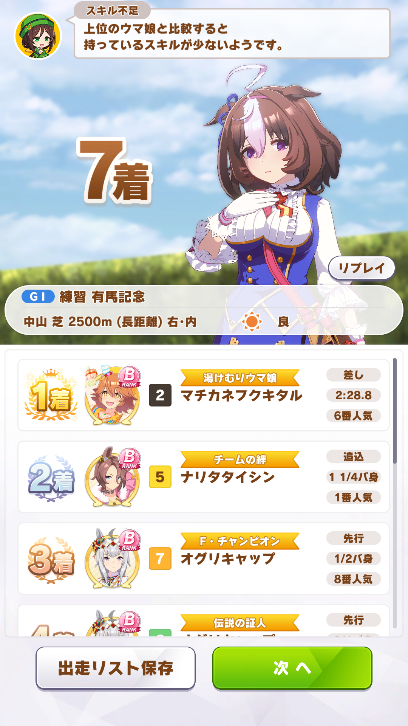 中距離のベストで加速と回復ができるチャンミが来たら猛威を振るいそうだ借りた練習パートナーが強すぎて全然勝てない。クリオグリとタイシンが特に強い。
