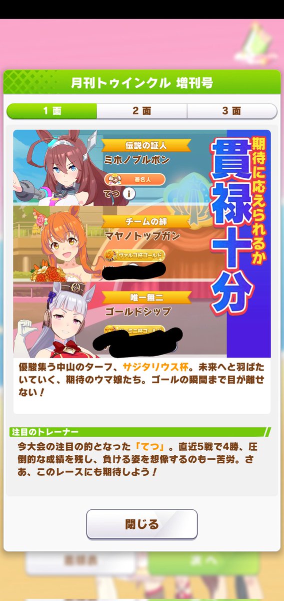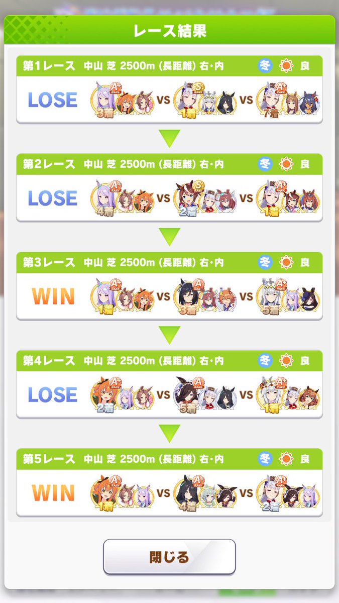 逃げしかできないトレーナー pic.twitter.com/6HUb3BIn1oチャンミ初めて決勝Aグループ進出。やはり自分が逃げウマ2出して競り合わせる方が強いなって思いますた。そしてマックイーン最強!!ゴルシ最強!!(ブルボンちゃんは申し訳ないが競り合い要員として弱めのを採用したけどふつうに勝ってくれましたありがとうございます……) pic.twitter.com/WXWuH7fcwX pic.twitter.com/s9FIqtunKPチャンミが逃げもそこそこ勝てるっぽいからマルゼンスキーガチ育成することにしてるけど残り二人どうしよサジタリウスR2になってから心なしか逃げ増えたような