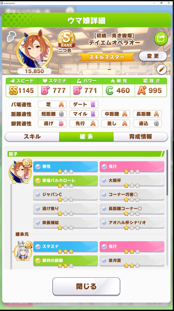 新オペラオー、スキルは強いけど長距離の先行がキツイ感じか新衣装オペラオー、育成中の0スキルでも強いんだけどオペラオー普通に強いなオペラオーやはりそこそこ強いんだオペラオー固有はすごく族だから強いえっっ新オペラオーってもしや強い??通常オペラオー持ってないからほしい振袖オペラオー、ステ盛りやすい!振袖オペラオー普通につよそうなんだよなぁ振袖オペラオーいい性能してるから欲しいな
