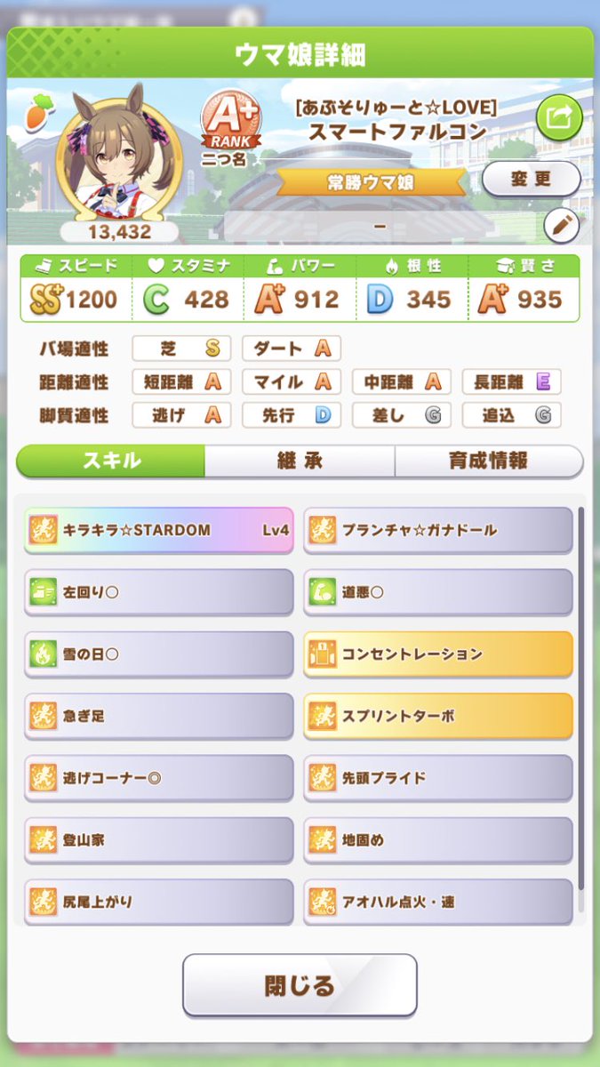 魔改造ファル子は育成してて楽しい。これアレか、ファル子で運良く冬ウマ娘ゲット出来るまで頑張るしかないのか…とりあえず短距離最強のファル子を育てるために芝因子いっぱい持ってるウマ娘の育成を始めます次のチャンピオンズミーティングでファル子が強いとかいう噂を耳にして因子厳選を開始したは良いが…如何せん短距離チャンミ(中京)が初なのでどのウマ娘が強いのか全くの手探り感があって「果たして本当にこのウマ娘をチョイスしていいのか」という疑念が尽きぬ。トテモコワイ
