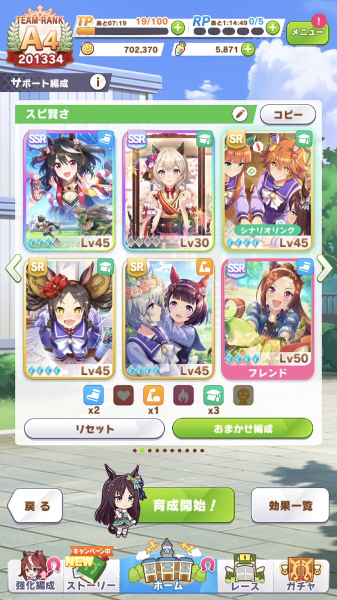 短距離はコンセ役に立つ気もするからスピ2賢さ3たづなかなって思ったけどパワー補正ないウマはたづなをパワサポにしたいなって思ったけどバクシンはスピ1パワ1でいいわってなったパワー5、賢さ2、芝6、短距離2。ここから何処まで行けるか短距離育成ってスピ賢がトレンドなんだろうけど、今回はパワーがすごく重要な要素だと思うんですよなんで、スピ賢でパワーうまく盛れない人は、ちゃんとパワー刺してスピパワカンスト目指す方が強い気がします。