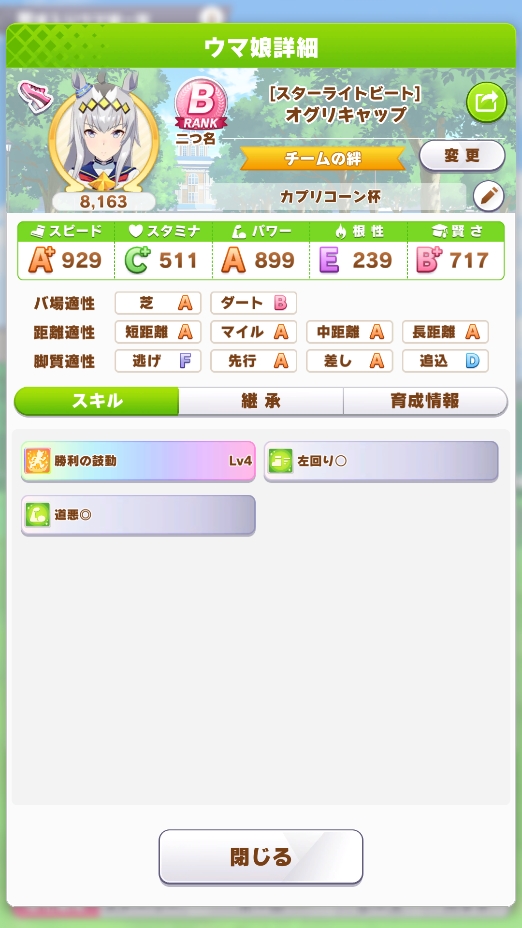 短距離因子が3の2人を使って因子要因を用意してオグリを短距離仕様に改造、中盤でも抜くようにと賢さを上げました