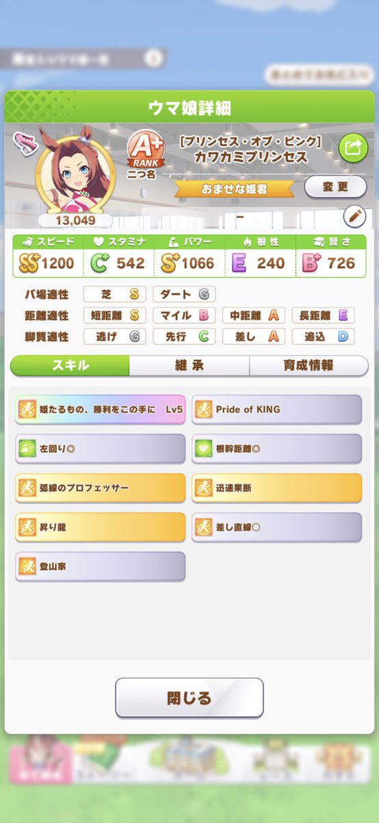カワカミだとオークスで登山家貰えるし短距離適性もそんなに悪くないからチャンミで使えるかも、という試作。差し直線と根幹距離の代わりにスプリントターボが欲しかった。 pic.twitter.com/JBx1840lkz