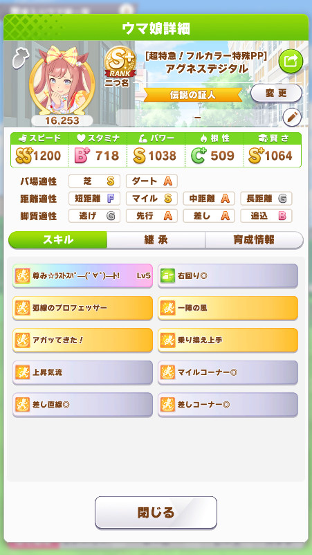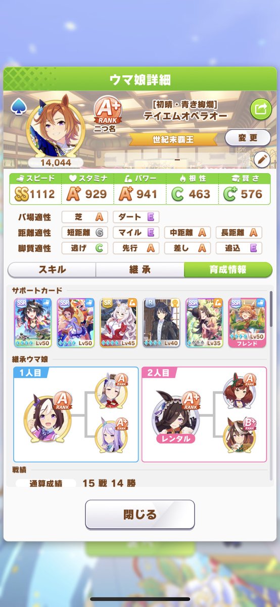 あ〜、SSRフクキタル、これは確かにぶっ壊れた性能だわ。アオハルジュニア期に運悪く負けたから全般的に下振れ路線、フクキタルイベント1回目で失敗にも関わらず、これだけステータスが盛れてる。しかもR代理と1凸パワーライスの編成で。とりあえずこれ競技場出してみる。 pic.twitter.com/Hxux8TuIXj