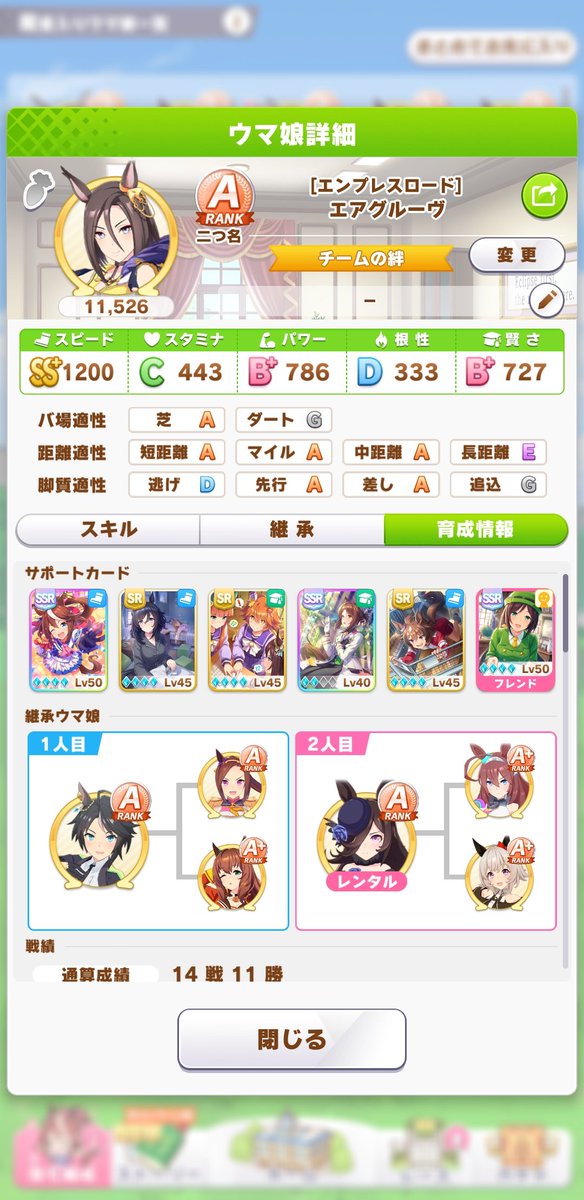 短距離ウマ娘はスピードに成長率を持っているパターンも多いですし、スピード一枚でもたづなさんや賢さサポカを工夫すれば1100~は稼げるかも知れませんね。