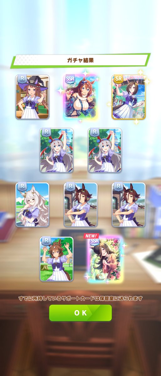 私のガチャ結果はキャラは新春ハルウララちゃんとモンクエルちゃん。サポカはグラスちゃんとキタちゃんでしたね。