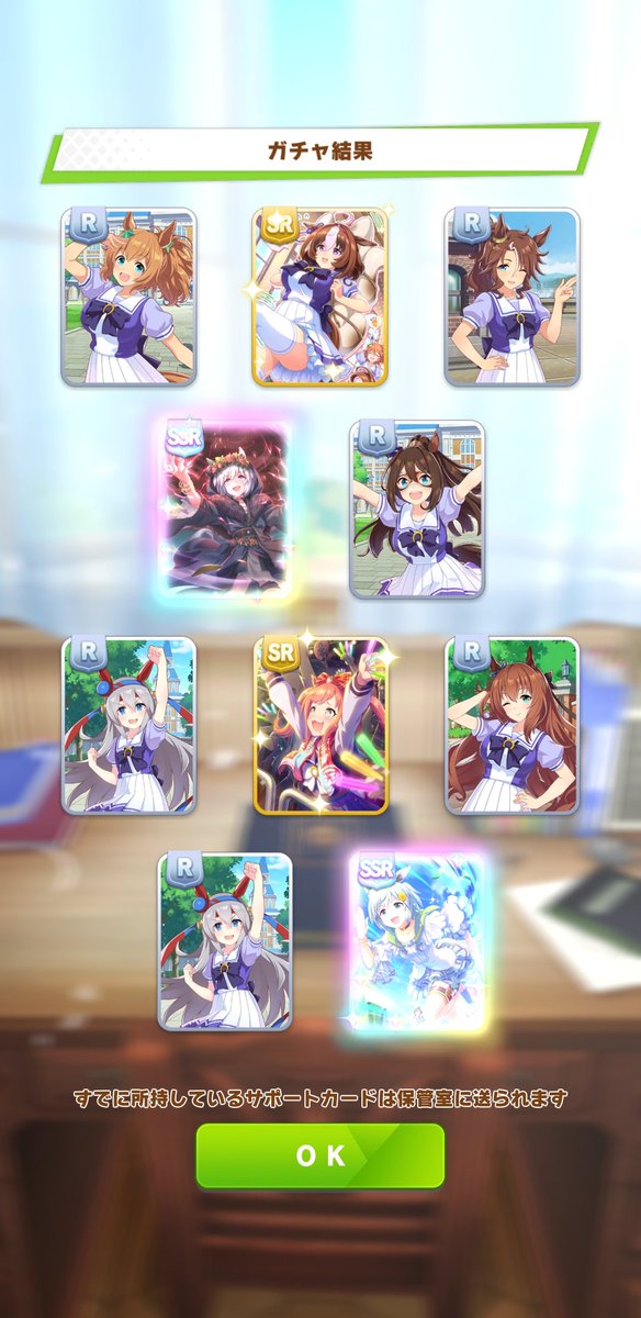 新春ウララちゃんは持っていなかったのでグッジョブ!キタちゃんは完凸済みなので虹の蹄鉄に変換。グラスちゃんは1凸。