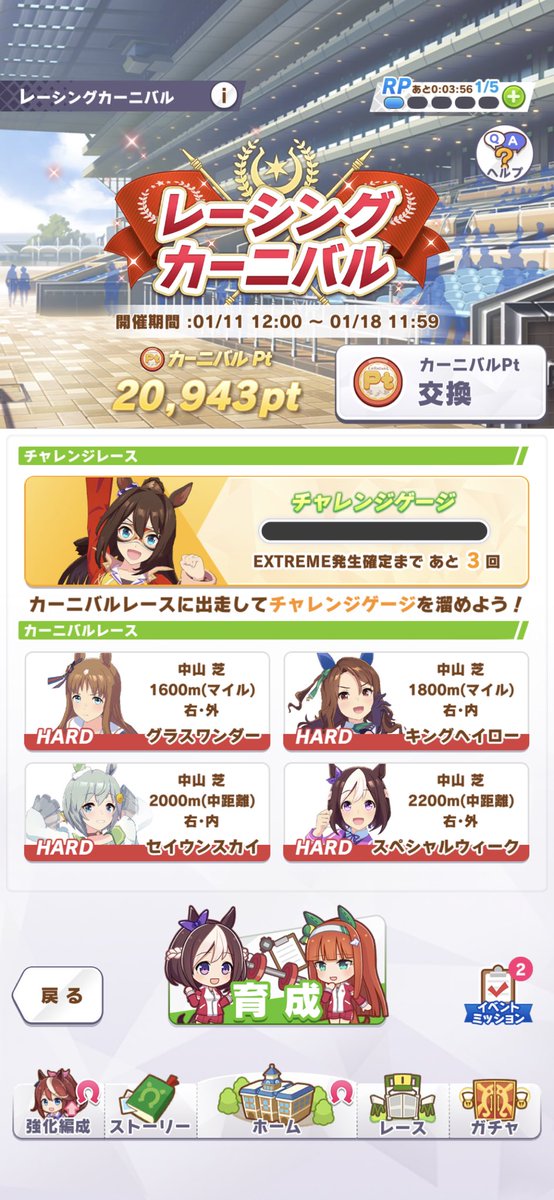 ハード2回ベリーハードorエクストリーム1回のセットで1万ポイント稼げるからカーニバル自体はアオハル1回やるより早く終わったわ322: 名無しのトレーナー 2022/01/12(水) 00:34:46.28 ID:EHgdgoJK0>>272