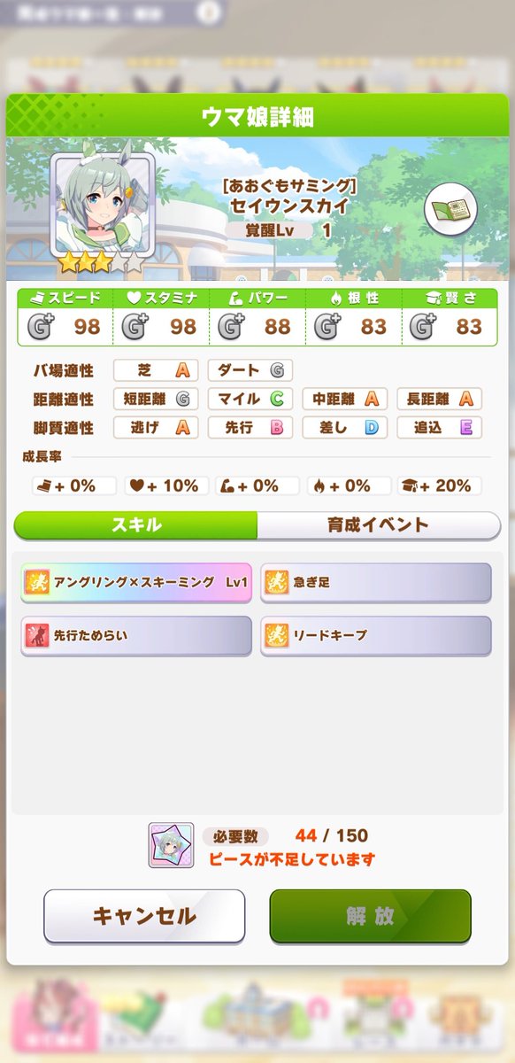 ほかはまず無理ウマ娘のイベント、今のやつは楽しくないけど、セイウンスカイのピースが20個集まるのはありがたいな。まだいないので……。(あと50個で解放できる)この一覧・解放って何だろうと思ってたけど漸く解ったわ。
