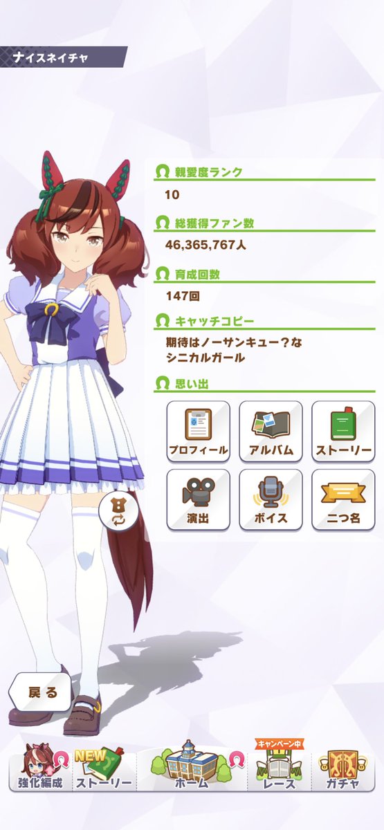 自分の持ちウマ娘の育成回数で数字高いのがマヤノ、ダスカ、ネイチャ。サポカ貧弱時代のライブラ杯辺りにジュエル割ってめちゃくちゃ育成してた記憶。ダスカはとりあえずの因子厳選で一番育成してる pic.twitter.com/cn1Mwh9TW2実は一番育成回数が多いウマ娘はマックイーン@sakemilin 私はバクシン(22回)ですね~@sakemilin うちもマックイーンが一番っす(・ω・)