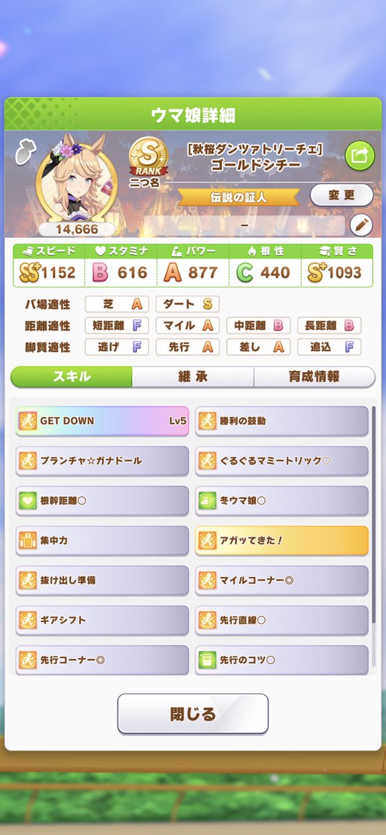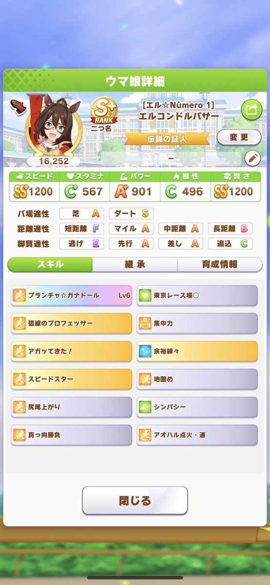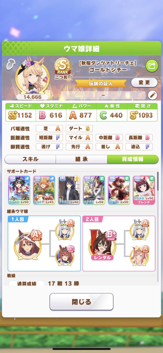 パワーS行けなかったのはスピ賢さカンストを考えすぎたせいか。。スタミナもB行けたな。