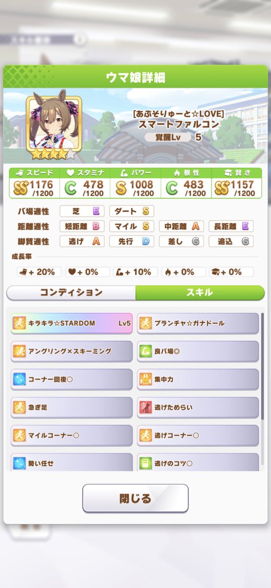 スタミナの5%減らしたらいけるか?ファル子にコンセと尻尾上がりつけるのを諦めればだいぶ育成が楽になるな?