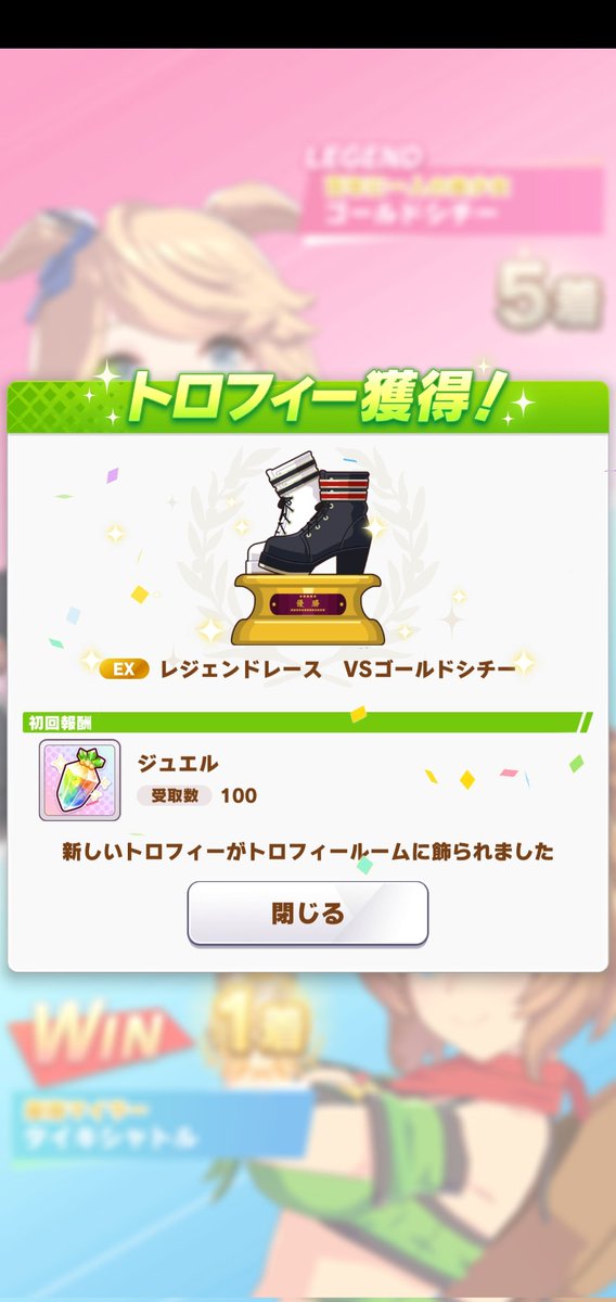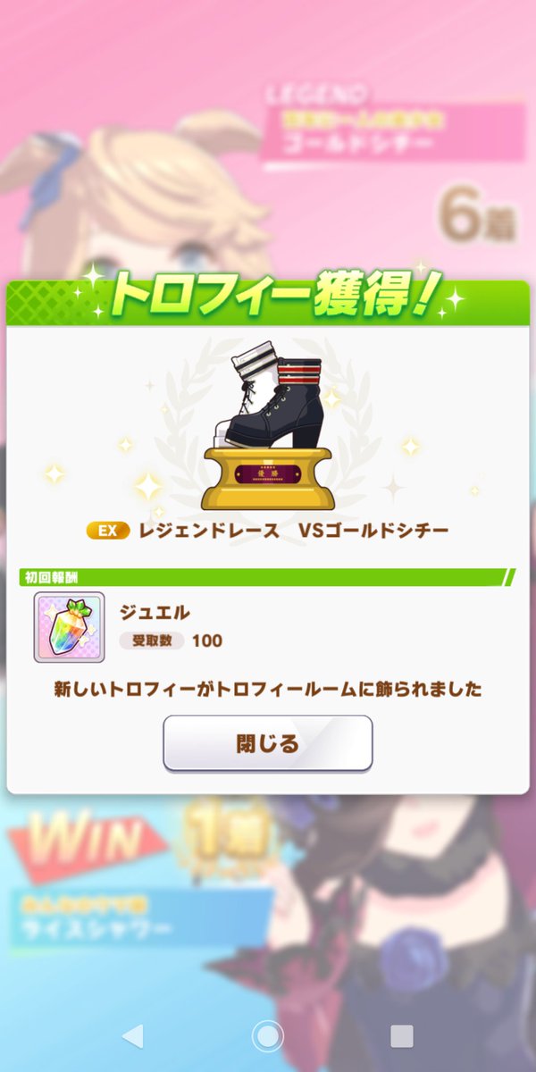 シチーさんの靴ありがたくいただいていぐべ~シチーさんの靴をブン獲って新たなトロフィーもゲットしたので、もぐもぐタイムならぬ毎度恒例ニヤニヤタイムに入りつつ、シチーさんの靴もコレクション棚に並べて眺めながら悦に入っております(*´∀`)←キモ #ウマ娘 pic.twitter.com/ys8FSwBoI5さて、ひとまず対シチーさん戦の記念すべき一番槍は…ライス!いっちょ頑張ってきなさい(*´∀`)!という訳で、マイル適性Aのうちのライスに死角はないッ(`∀´*)! まずは初回報酬とトロフィー、そしてシチーさんの靴をゲットだぜー!! #ウマ娘 #ライスシャワー #ゴールドシチー pic.twitter.com/jqzL4dC71B今日からレジェンドレースはシチーさんになりましたね(*´ω`) ひとまず今回のラスト3戦目という事で、ピースも靴もトロフィーも、戦利品は余すところなく召し上げますぜシチーさん(`∀´*)!! #ウマ娘 #ゴールドシチー pic.twitter.com/AtBqBU5Y3kシチーさんの靴狩り完了!