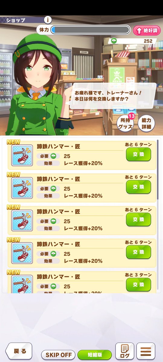 クライマックスに進むまえに、「蹄鉄ハンマーを使わなくてもよいのですか?」ってたづなさんに警告してもらいたい。介護してくれ、おれを!ラスト前のショップ更新でやたらとハンマーが並ぶのは仕様なんだろうか