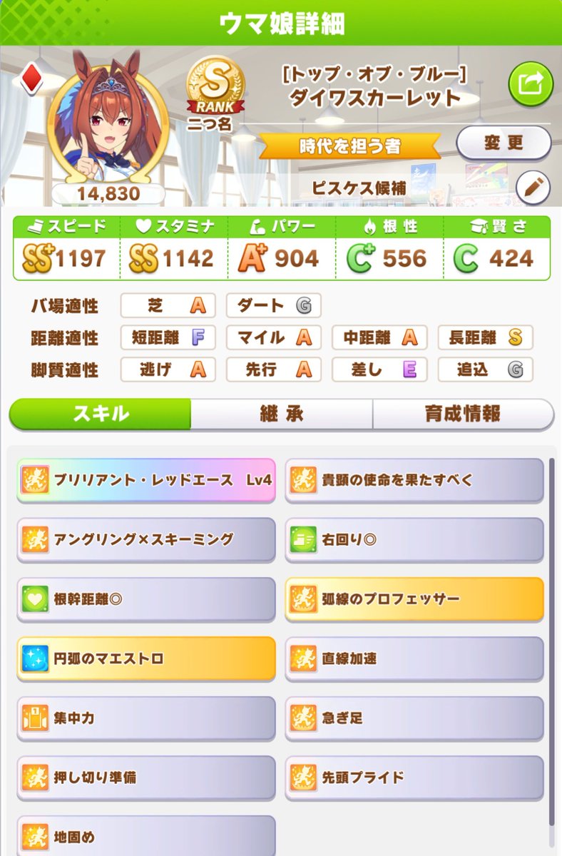 固有がかなり強力みたいです!根性20補正もスタミナ編成で地味に良い仕事しそう!