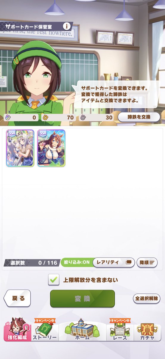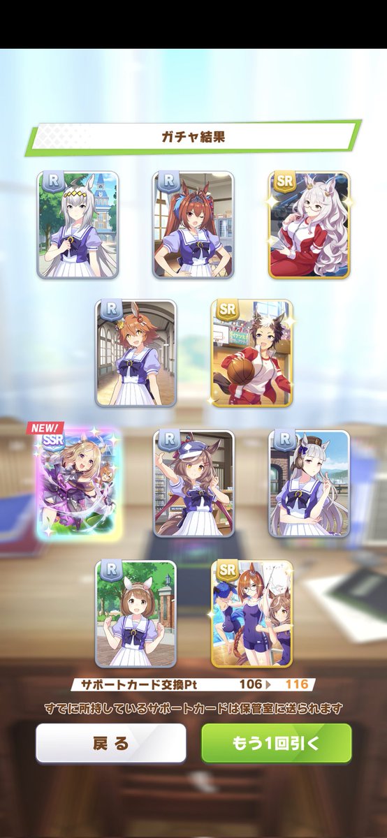 考えた末にトプロだけでなくアヤベも完凸のチャンスなので2天しどちらも完凸(トプロは虹結晶2個使用)。最近超絶に引きが悪かったので不安でしたが、結果はすり抜け祭りでした(テイオーあふれ、ターボ1凸、ニシノ3凸、ネイチャ×2で2凸、マヤノあふれ、バクシン2凸キタちゃんあふれ)欲に負けて深夜のトプロ完凸?