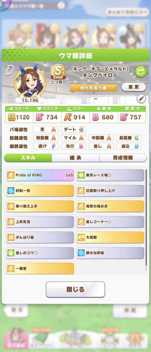 ピスケス杯用キングヘイローお試し版。レジェンドウマ娘ルートで安定してステ盛れるので育成の目処が立った感じ、逃げ1の場合はそこそこノンストップガールが出るので中盤スキル盛れば追込でもいけるかも pic.twitter.com/ZlQWuJkslsピスケス杯用キングヘイローその2