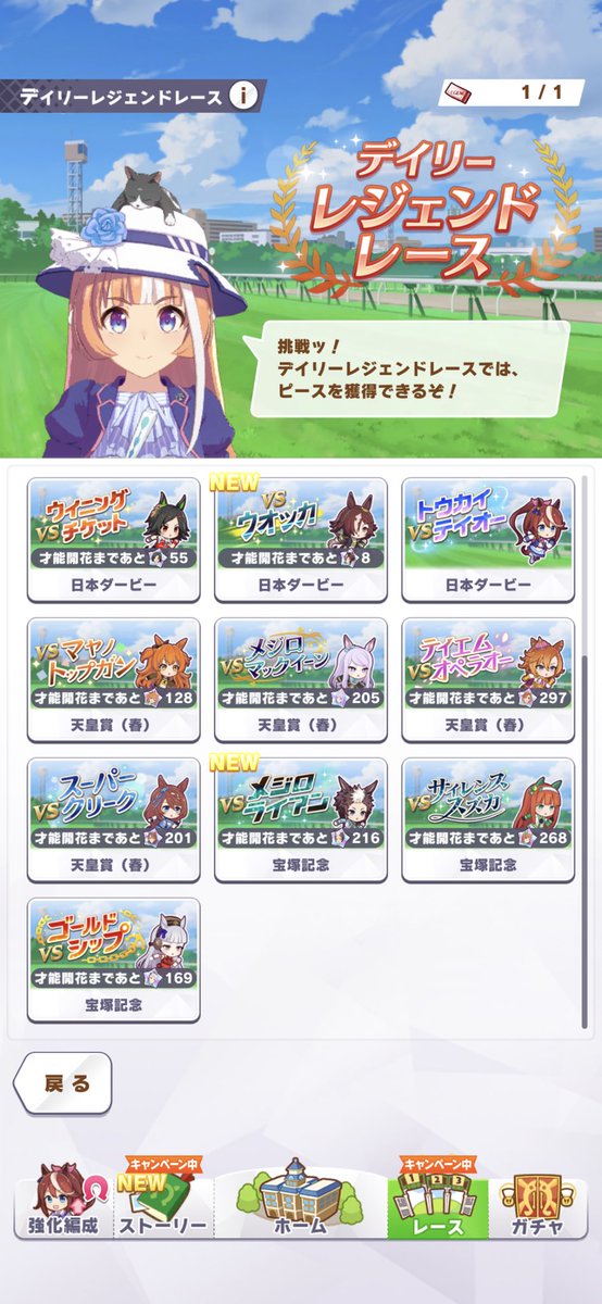次はブルボンくる?名無しのトレーナー追加あるだろうけどまとめてくるだろうからハニバ辺りまではこのままな気がする名無しのトレーナー才能開花迄の数表示してくれてるのはありがたい名無しのトレーナータイキ戦どうせマイルだと思ってたら短距離で普通にまけました名無しのトレーナーそうだねどこからみてもマイルだね名無しのトレーナーよりによってほぼドンピシャで終盤に固有出るコースなのが笑えてくる名無しのトレーナー配信してしばらくしてから始めたからチケゾー以前がNewなのはいいけど