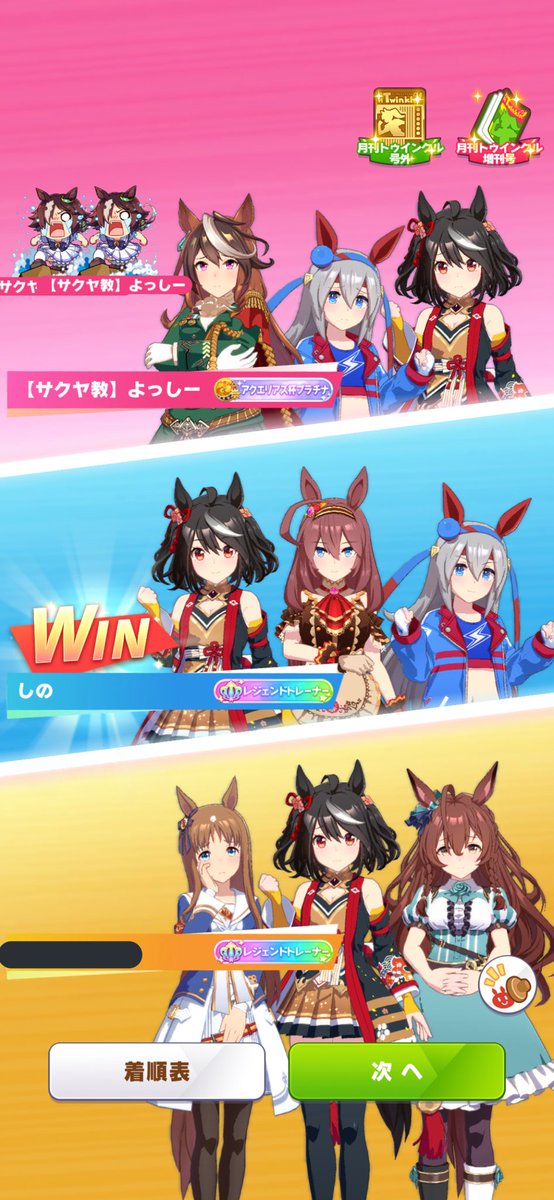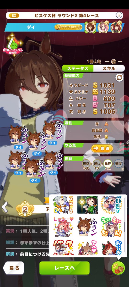 マチタンを走らせて出走前と勝利後でえいえいむん連打してみたいな。そのためだけに次のチャンミはマチタン育てようかな?