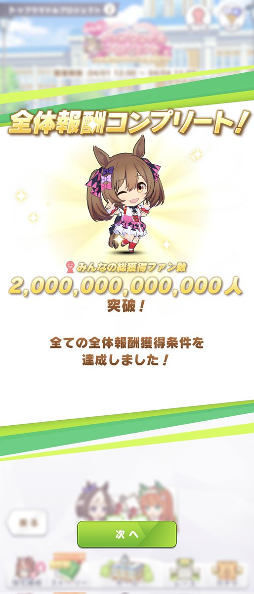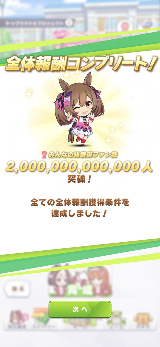 2日で2兆人ファンにしやがった名無しのトレーナーおかしいな兆って数字はそんな軽々しいものじゃなかった筈だが名無しのトレーナーファル子は超銀河アイドルだからな…名無しのトレーナーそろそろやるか…♠︎って思ったら達成してた名無しのトレーナートレーナー「2兆人か…思ったより集まり悪いな