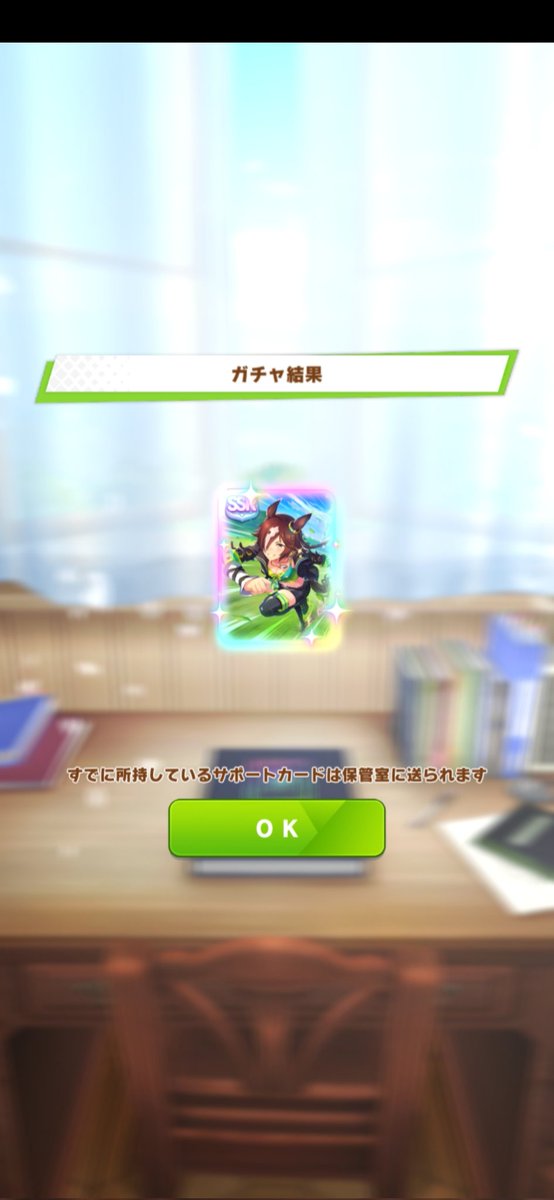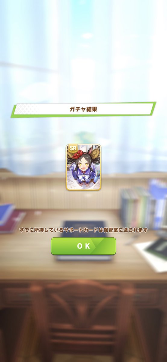 月2回の蹄鉄交換で得られるSR以上サポカガチャ。2回回したうちの1枚が根性SSRウィニングチケットになった